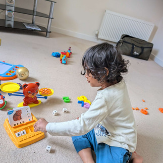 After snack time 🍎, M enjoyed some drawing, practising both his letters and numbers, and creating happy little faces ✏️😊. He was eager to dive into his new books, which sparked even more learning. Inspired by one story, M picked out the sound "CK" and began writing crack on his drawing pad. He even used the dice to form the word and matched it up—such initiative! 📖🔤