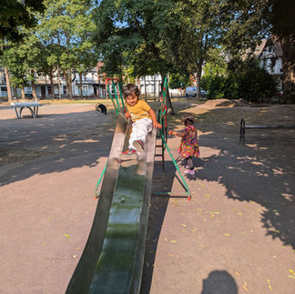 We kicked things off with the swings, soaring higher and higher with big smiles and giggles. Then it was on to the slidesāstarting small, they confidently climbed up on their own before moving on to the medium slide, which brought even more excitement! šš