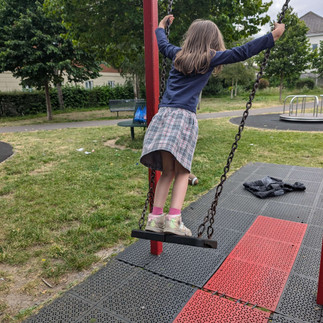 Today we adventured down to Cyril Park. When we arrived we noticed they had fixed the tyre swing so A had some fun spinning around on their while O played on the swings. They then played kings and queens on the climbing frame using the slide as their royal exit before playing 'Hop on, Hop off' on the roundabout which they were both very good at and very proud that they could jump on while it was spinning.