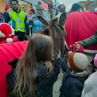 Once the rain stopped we headed into Boscombe to watch the Nativity play, everyone enjoyed this we followined the star as they moved around, listened to the story of baby Jesus, joined in with singing the Christmas songs and at the end there was real life donkeys. A really wanted to stroke them and O also had fun doing so, then every child got a gift of a selection pack and a book of the story.
